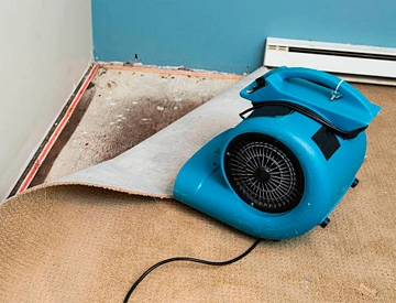 Water damage restoration professionals using drying equipment to dry floors and prevent further water damage in a home.
